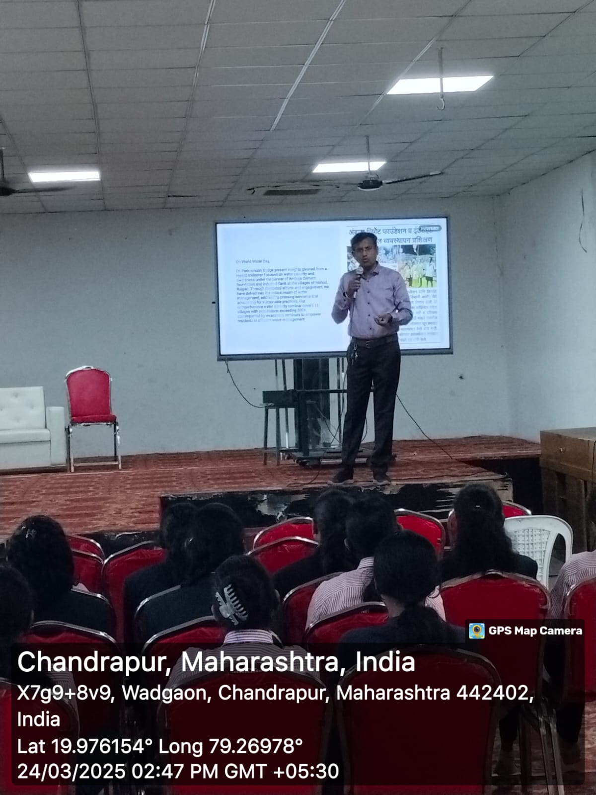 आपल्या भाषणातून डॉ. पी. ए. गाडगे सरांनी जागतिक जल दिन दरवर्षी २२ मार्च रोजी साजरा केला जातो , पाण्याचे महत्त्व आणि जलस्रोतांचे व्यवस्थापन याबद्दल जागरूकतां वाढवणे हा या दिवसाचे महत्त्व अधोरेखित केले,जागतिक जल दिनाचे काही महत्त्वाचे मुद्दे विध्यार्थाना पटवून सांगण्यात आले.